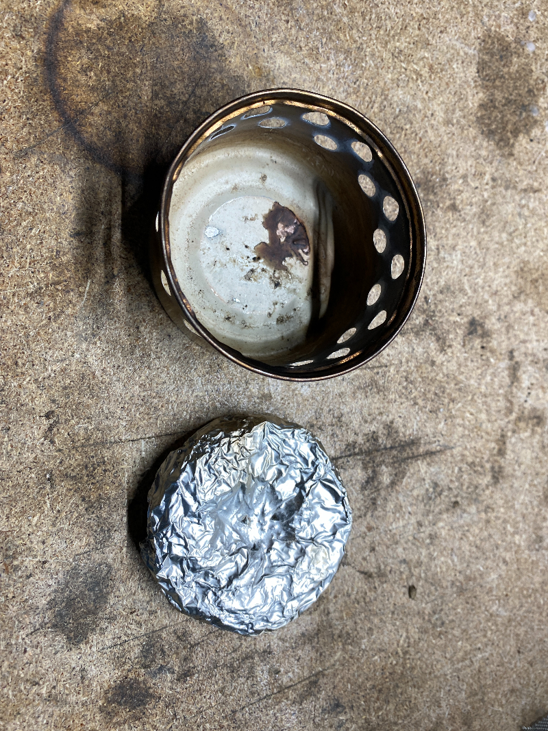 Then I realized the biscuit could fit into the Fancy Feast stove. The stove would contain any leaks from the foil, the biscuit would reduce the spill risk, and hopefully slow down the fuel consumption.
